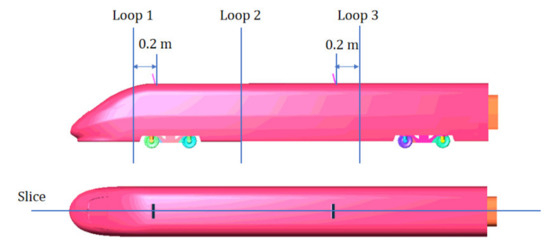 In combination with the conclusion of Section 4.1, we selected the head car with the braking plate position to compare with the head car without braking plates, as shown in Table 5. The drag force increased by 85.7%, the lift force increased by only 7.6%, and the side force decreased by 5.9%. We made the slice and loops as shown in Figure 10 to analyze the differences between the two models. The slice is located at the symmetry axis of the train. The comparison result is shown in Figure 11.