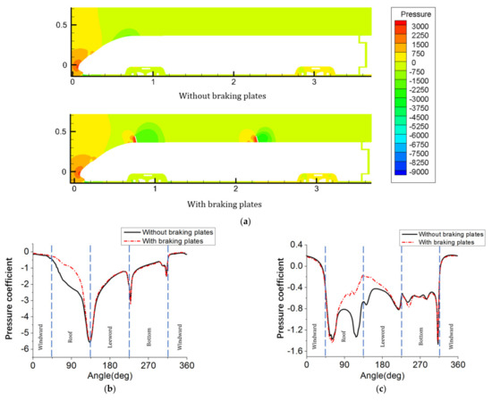 - The braking plate has a huge influence on the pressure coefficient of the leeward side and the upper side of the head car, especially the upper side. The braking plate has little effect on the pressure coefficient at the bottom of the train and has almost no effect on the windward side.