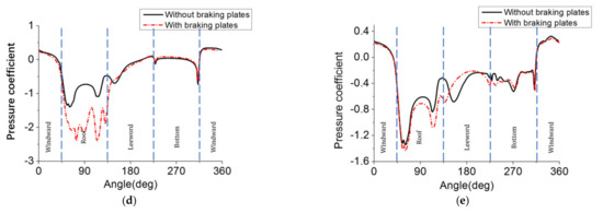 The biggest difference in loop 3 is at the roof of the head car. Different from the first two loops, the negative pressure coefficient at the upper side of the vehicle with braking plates is larger than the train without plates. This is due to the blocking effect of the braking plates causing eddies to appear at the rear of the plate [9,10].