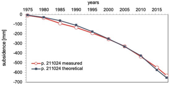 As a result of the calculations, the forecasted values of deformation indicators for the period of 12.30.2019 were obtained. The calculated maximum subsidence value for an exemplary field of 114 caverns equaled 81 cm, while the measured value amounted to 79 cm. In Figure 5, the course of the levelling point subsidence no. 211024 located above the cavern field in the period of 1975–2019 is presented as the comparison of theoretical course and geodetic measurements. Geodetic measurements have been carried out since 1973. Approximately 850 points were levelled each year. The levelling campaign was over 130 km. In addition, 10 fixed points were located outside the subsidence trough.
