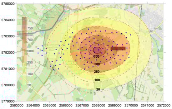 All 114 caverns were included in the calculation and their geometries and the course of the phases of use in time. The data pertains to the time period starting in 1972. Exemplary data attributed to the cavern no. S_004, characterising its individual production phases, are presented in Table 3. The calculations were carried out for the following values of characteristic parameters of the EPE cavern field: angle of main influence—β = 34°, subsidence coefficient—a = 1.0, and delay time Δt = 4 months.