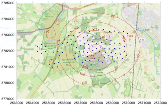 In Figure 7 results of theoretical calculations of horizontal displacement in mm over the EPE cavern field–as per 12.30.2019 are shown with three measuring points (u1, u2 and u3) where horizontal displacements were measured.