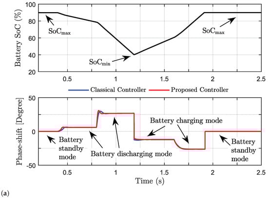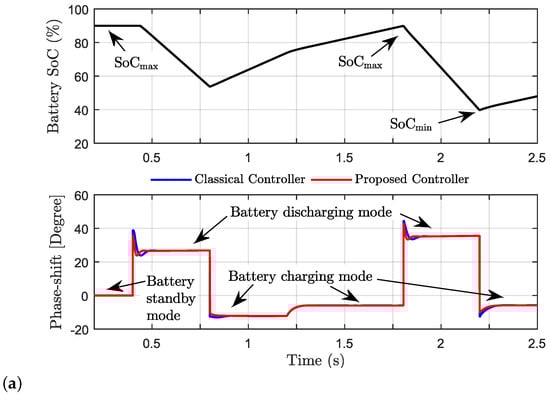 The BESS will continue to operate in battery discharging mode until any load/ generation condition occurs or its lower battery SoC limit () is reached. At time s, the powers that are consumed by loads decrease (-W)); as a result, the PV power (-W) is larger than loads needs (-W); thus, the battery absorbs the extra power from the PV system, thereby, the BESS starts operating in battery charging mode (cf. Figure 9b). When this occurs, the dc-bus voltage is regulated by the DAB converter of the PV system, i.e., it operates in voltage mode control, as discussed in Section 3 (cf. Figure 6b). This transition between operation modes is performed by the power management algorithm. When the BESS operates in battery charging mode, the phase-shift () must be between ; thus, the pulse voltage of the primary full-bridge () is lagging behind the pulse voltage of the secondary full-bridge (), as shown in Figure 10b.