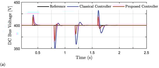 The load/generation and operation mode conditions cause undesired voltage oscillations in the dc-bus voltage, as shown in Figure 9a. For the operational conditions that are addressed in this test, the bus voltage oscillations are pretty small when the dc-bus is regulated by the proposed nonlinear robust controller, improving the time-domain transient in comparison with a classical controller. Hence, the proposed controller outperforms the classical controller, due to the minimum voltage oscillation occurrence (voltage sag and voltage swell) in the dc-bus.