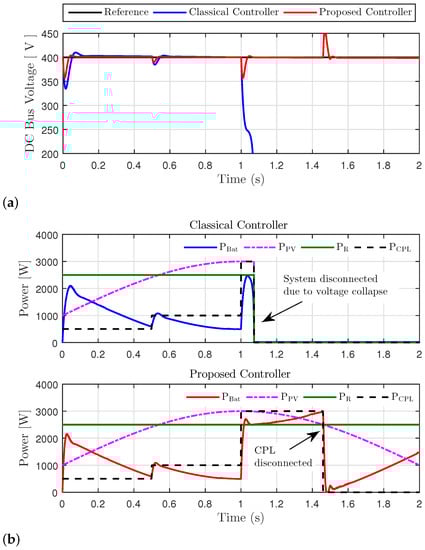 The BESS supplies the extra power to dc MG in order to ensure the power balance under different load/generation power conditions. (cf. Figure 13b). At s, a large CPL power variation is performed from 1000-W to 3000-W. The proposed controller achieves remaining regulation of the dc-bus voltage under this CPL power variation. However, the classical controller cannot compensate the significant oscillations in the dc-bus voltage leading to dc voltage collapse, as shown in Figure 13a. Note that saturates when the large CPL power variation occurs and the dc-bus is regulated by the classical controller. However, when the dc-bus is regulated by the proposed nonlinear robust controller, does not saturate; thus, the regulation of the dc-bus voltage remained, even under large disturbances (cf. Figure 13c).