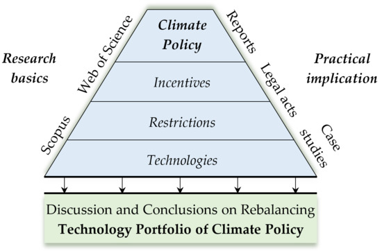 It is beyond the scope of this paper to analyze one or the other position on the causes and consequences of global warming. The key position is that the growth of technogenic GHG emissions is a problem for humanity. The discussion field for this review is built around the decisions that are made within the framework of climate and energy policies under the presence of uncertainty in the range of economic, social and technological issues. The methodological framework of this review is showed in Figure 2.