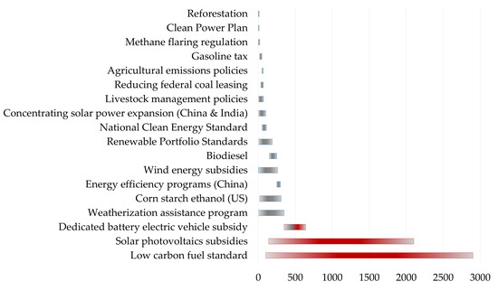 However, 10 years later, this situation can already be seen from the perspective of the results and the real effectiveness of the selected measures. According to [49], the cost of reducing emissions of 1 ton CO2 in the U.S. is between 115 and 530 USD, which is 10–50 times higher than most estimates of the SCC, which was mentioned earlier, and an order of magnitude higher than those given in the report by McKinsey. Even the current cost of capturing CO2 from the atmosphere is estimated at 94–232 USD/per ton CO2 [50]. By 2030, it may be less than 75–300 USD/t CO2 [51], and by 2040, it may already reach USD 50 [52]. In [53] an analysis of the cost of reducing CO2 emissions through various government regulation measures is made, the results of which are partly shown on Figure 4.