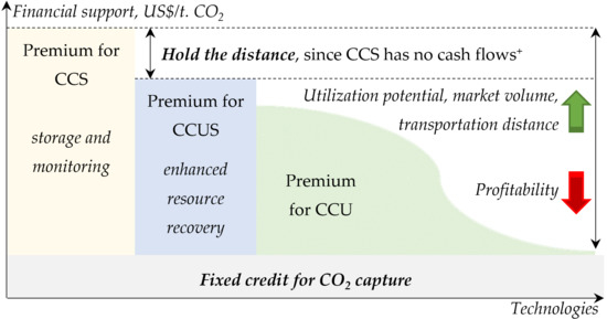 Stern’s [67] conclusion that there are many promising but underestimated ways to improve our climate initiatives that require further study seems to be the most true. For the CCUS technology group (including CCU), this is also confirmed by a special report by IEA [6], which allocates at least 15 percent of the global reduction in greenhouse gas emissions. The value of developing CCU, however, lies in the fact that part of this technology group has a negative carbon intensity [68]. In addition, potential markets that CCU projects can reach are estimated at USD hundreds of billions [69], and CO2-based products can be quite competitively priced [70].