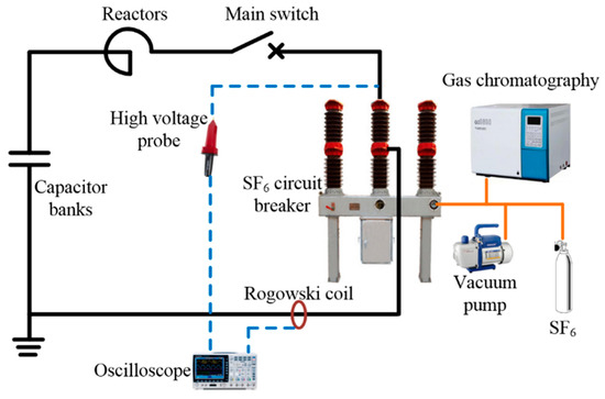 SF6 is a greenhouse gas. It is one of the six gases included in the Kyoto Protocol aimed at reducing greenhouse gas emissions. The global warming potential (GWP) of SF6 is 23,900 times greater than CO2 according to the 2013 report of Intergovernmental Panel on Climate Change (IPCC), and it has a lifetime in the atmosphere of 3200 years. However, SF6 has excellent insulation performance, arc quenching performance, and molecular stability. It is widely used in high voltage circuit breakers [1,2]. The high voltage SF6 circuit breaker will inevitably produce a high temperature and high energy arc in the process of breaking currents. It will cause SF6 to decompose and form SF6 arc plasma. Many sulfur fluorides such as SF5, SF4, SF3, SF2, SF, S, and F will be produced in the arc plasma. As the arc extinguishes, the arc temperature will gradually decrease, and these species will recombine into SF6 molecules [3,4]. However, there are trace H2O and O2 impurities in the circuit breaker, and the nozzle made by polytetrafluoroethylene (PTFE) material will be ablated by arc to produce trace PTFE vapour during the breaking process. The H2O, O2, and PTFE impurities will participate in the reaction of SF6 arc plasma to form various by-products such as SOF2, SO2, SO2F2, CF4, C2F6, C3F8, CO2, CO, and HF [5,6].