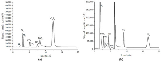 This gas chromatograph was equipped with a hydrogen ionisation detector (FID) and a pulsed flame photometric detector (PFPD) to detect SF6 by-products. The carrier gas was He with purity over 99.99%, the output pressure was 0.5–0.6 MPa, the injection temperature was 150 °C, the injection volume was 250 μL, the split ratio was 20:1, the column temperature was 50 °C for 5 min, and 10 °C/min is raised to 200 °C for 10 min. Figure 2 shows the test result of gas chromatograph. The detected gases in channel A were H2, O2, N2, CO, CH4, CO2, CF4, and C2F6. The detected gases in channel B were SF6, SOF2, SO2F2, SO2, COS, C3F8, and CS2. Trace H2O content was measured using a SF6 mirror dew point instrument. This instrument is often used in the field detection of trace H2O content in SF6 circuit breaker, with the advantages of fast response and high precision.