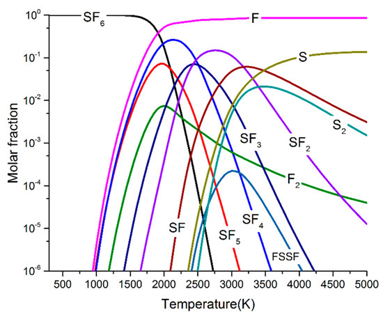 - SF6 molecules began to decompose at about 1000 K and form SF5, SF4, SF3, SF2, SF, S, and F with the increase of arc temperature. The maximum molar fractions of SF4 and SF2 were higher than SF5, SF3, and SF. As the arc temperature gradually decreases to room temperature, all low fluorine sulphides recombine into SF6.