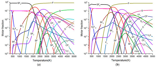 Particle composition of SF6/polytetrafluoroethylene (PTFE) arc plasma at 0.6 MPa. (a) 90% SF6 + 10% PTFE. (b) 80% SF6 + 20% PTFE.