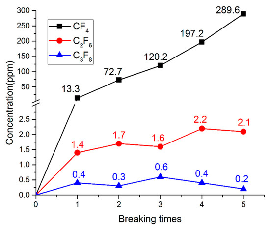 The change of CF4, C2F6, and C3F8 concentrations with the breaking times.