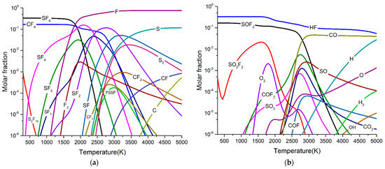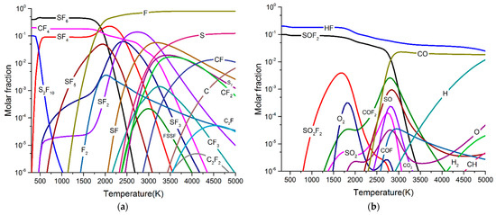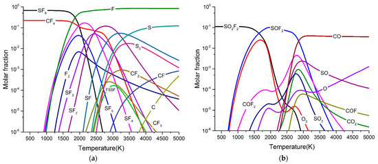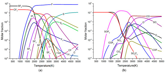 Figure 6 and Figure 7 show the particle composition of SF6/PTFE/O2 arc plasma with different O2 concentrations. Compared with SF6/PTFE arc plasma, a large number of particles containing O element such as SOF2, SO2F2, COF2, SO2, CO, and CO2 appear in arc plasma. CO appears in the temperature range of 2000 K–5000 K. CO2 and SO2 appear in the temperature range of >1500 K. COF2 appears in the temperature range of 1000 K–4500 K. As the arc temperature gradually decreases to room temperature, the molar fraction of these species will be reduced to <10−6. SOF2 and SO2F2 can appear in arc plasma when the temperature is less than 1000 K, and their molar fraction is much higher than that of CO2, SO2 and COF2. Therefore, it can be concluded that the participation of a small amount of O2 will promote the formation of SOF2, SO2F2, COF2, SO2, CO, and CO2. After the arc is extinguished, the concentration of SOF2 and SO2F2 will be higher than that of COF2, SO2, CO, and CO2.
