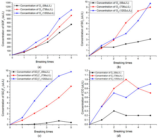Figure 8 shows the changes of SOF2, SO2, SO2F2, and CO concentrations with the breaking times under different O2 concentration. As shown in Figure 8a, the concentration of SOF2 increases with the breaking times. When the O2 concentrations are 59 ppm, 748 ppm and 1130 ppm, respectively, the concentrations of SOF2 can reach 761 ppm, 983 ppm and 1121 ppm, respectively, after five breaking experiments. This indicates that the increase of O2 concentration can promote the formation of SOF2. As shown in Figure 8b, the concentration of SO2 increases with the breaking times. The concentrations of SO2 were 3.1 ppm, 9.0 ppm and 9.7 ppm, respectively, after five breaking experiments. As shown in Figure 8c, the concentration of SO2F2 increases with the breaking times. After five breaking experiments, the concentrations of SO2F2 are 0.4 ppm, 7.1 ppm and 9.8 ppm, respectively. This indicates that the increase of O2 concentration can significantly promote the formation of SO2F2. Figure 8d shows the change of CO with the breaking times. It can be seen that the concentration of CO is very low, and the highest is only 1.0 ppm. Due to the limitation of experimental conditions and the accuracy of testing equipment, when O2 are 736 ppm and 1202 ppm, CO has no significant regularity. When O2 is 59 ppm, the concentration of CO is obviously lower than the former two cases. This indicates that the increase of O2 concentration can also promote the formation of CO, but this phenomenon is not obvious.