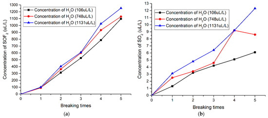 Figure 11 shows the changes of SOF2, SO2, CO2, and CO concentrations with the breaking times under different H2O concentration. It can be found that the concentration of SOF2, SO2, CO2 and CO increase with the breaking times. The increase of H2O concentration can promote the production of SOF2, SO2, CO2, and CO. For example, when the H2O concentrations are 106 ppm, 748 ppm and 1130 ppm, respectively, the concentrations of SOF2 are 1097 ppm, 1130 ppm and 1253 ppm, respectively, after five breaking experiments. This conclusion is consistent with the calculation results of particle composition of SF6/PTFE/H2O arc plasma.