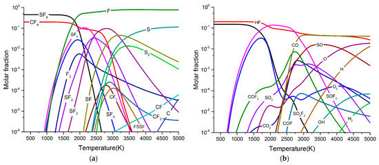 Particle composition of 60% SF6 + 20% CF2 + 10% H2O + 10%O2 arc plasma at 0.6 MPa. (a) SF6, SF5, SF4, SF3, SF2, SF, S, S2, F, F2, FSSF, CF4, CF3, CF2, CF, and C particles. (b) SOF2, SO2F2, COF2, COF, O2, O, SO2, SO, CO2, CO, HF, H, H2, and OH particles.