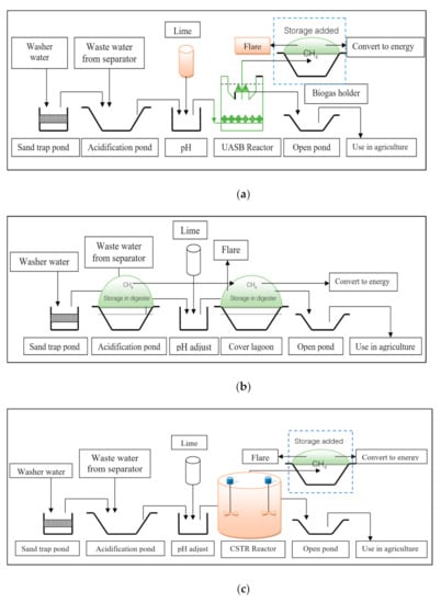 Additionally, there were five biogas technologies which were implemented in Thailand, including up-flow anaerobic sludge blanket (UASB), anaerobic covered lagoon (ACL), and continuously stirred tank reactor (CSTR), anaerobic fixed film reactor (AFFR), and hybrid reactor (HBR). Those technologies attribute different efficiencies and investments, which are essential factors. They are also related to wastewater odor, methane emission, and fuel prices. However, some plants wasted biogas by flaring without any benefit. That was due to the oversized or non-optimal design of the biogas system and the storage system. Furthermore, discontinuous raw materials caused unbalanced thermal energy utilization.