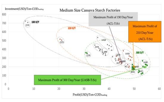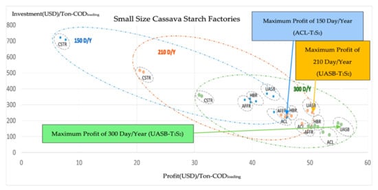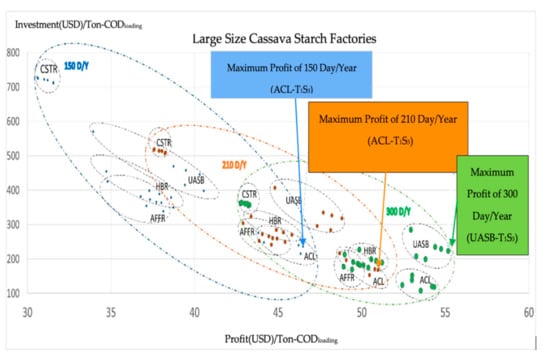 The investment costs are calculated by the study in calculating the linear cost function. The cost price cover the range of factory sizes in Thailand (50–400 tonnes per day). The profit of the study has a minimum value that has been beneficial for the financial model. The large size model checks and adjusts costs before calculating Equation (5), (9), (12), (14), (16), (18), (21), and (24). These data were the average value from the actual implement of BPPI.