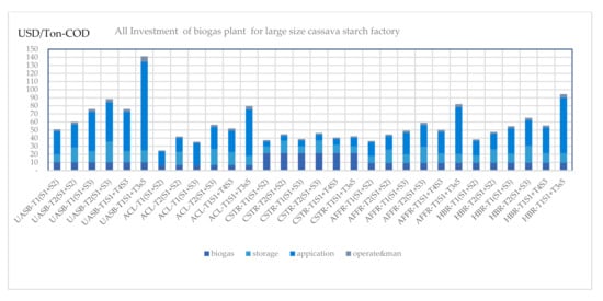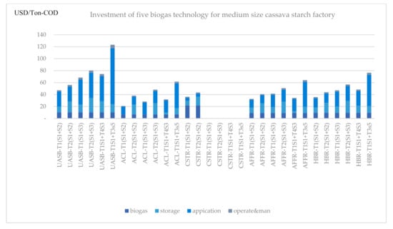 The investment cost (Invj) of the biogas systems for the five technologies studied, defined as USD kg−1 CODremoval, is used for Equation (5), and listed in Figure 2f: