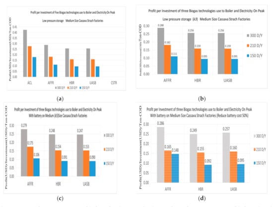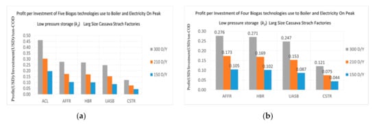 Medium-to-large starch processing plants typically have large-size systems, which can be the biogas for selling electricity during the peak periods at 0.0884 USD kWh−1. The on-peak hours in Thailand cover 9 a.m.–10 p.m. Monday–Friday. With the capacity, the excess gas production matched the operating time of 13 h per day.