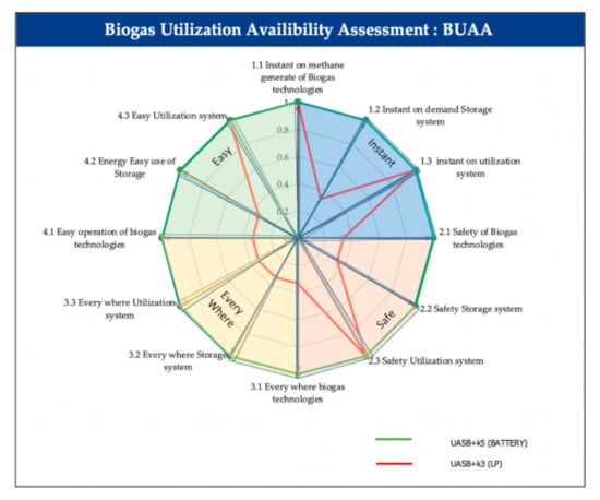In the biogas technology sector, some researchers developed the efficiency of biogas technology, including Lu et al. who studied methane that can be produced through anaerobic digestion using cassava starch wastewater []. The critical process parameters in an UASB reactor for wastewater treatment, operated by the days factor, were determined to comprehensively evaluate the performance. Phowan and Danvirutai presented a result, the highest efficiency of chemical oxygen demand COD removal, hydrogen yield, and methane yield compared with one-stage and two-stage CSTR processes []. Cavaleiro et al. showed the performance of an anaerobic hybrid sludge bed-fixed film reactor and used a neural network model and the fuzzy logic control performance [].