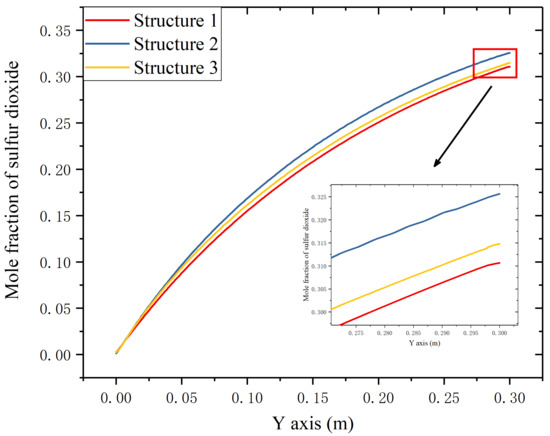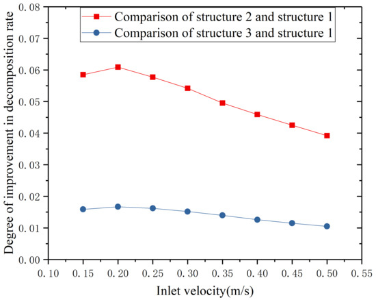 - The decomposition rate is negatively correlated with the flow rate. Nonetheless, the decomposition rate of sulfuric acid can be increased by up to 6.1%. The decomposition rate can be maintained at a relatively high level when the inlet velocity of the current structural design is about 0.2 m/s.