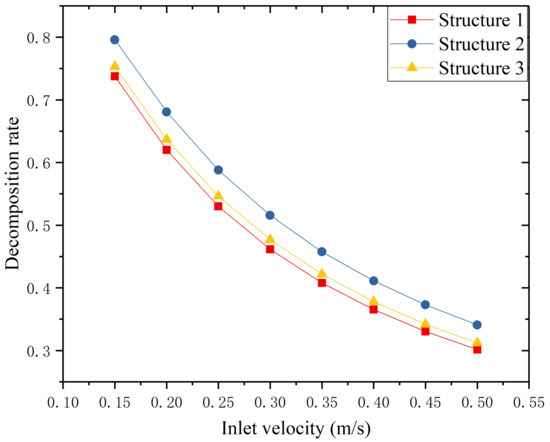 | Velocity (m/s) | Decomposition Rate of Structure 1 (%) | Decomposition Rate of Structure 2 (%) | Decomposition Rate of Structure 3 (%) |