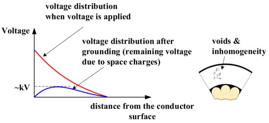 One of the original works on the subject of high-voltage testing of electrical insulation with frequency lower than power frequency was given in 1961 by Bhimani []. Before this, DC voltage tests as a more convenient substitute for power frequency test were performed with the same motivation of reducing the power supply. However, although DC voltage has proved effective over many decades for diagnosing the impregnated paper insulation, the applied DC voltage must be several times higher than that for the case of an AC applied voltage due to the absence of polarity changing. On the other hand, the resulting space charging effect under the influence of DC voltage would cause the preliminary damage of the insulation for polymeric insulated cables at high and extra-high voltages. An illustration of space charge effect after DC testing cross-linked polyethylene cables (XLPE) cables is shown in Figure 1. These are the main reasons why DC voltage test cannot represent a usable method of detecting faults in insulation system []. Moreover, it has been found that testing with DC voltage does not stress the insulation in the same way as that with power frequency, because of the great difference in voltage distribution through heterogeneous (laminated) insulation system under DC stress compared to AC stress. For instance, different layers of machine insulation with different permittivities and conductivities happen to have frequency- dependent field distribution. The field distribution has been found to be dominated by the conductivity of insulation at DC voltage and at very low frequencies. At power frequency, however, the field distribution is determined by the permittivity of insulation.
