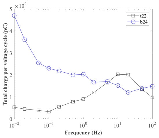 Total charge per voltage cycle of variable-frequency Phase Resolved PD Analysis (VF-PRPDA) measurements on two aged stator bars (epoxy-mica insulation) from a hydro-power generator; t22, b24 refer to Micapact insulation, where t means the half-coil from the top of the slot and b denotes it from the bottom of the slot. Reproduced from [].