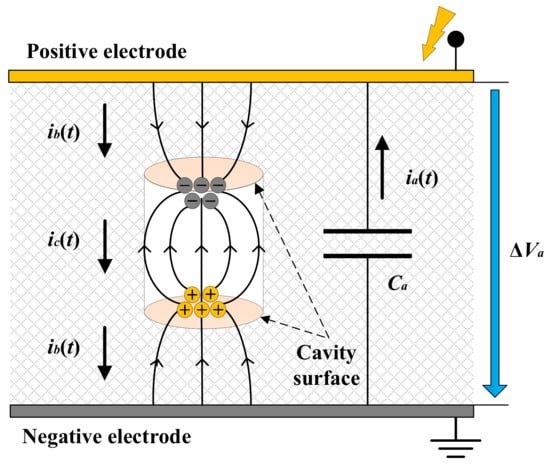 In the capacitive equivalent model, the apparent charge concept cannot reflect the real charge activity within the cavity. The electromagnetic transients detected at electrodes are not caused by discharging process of an imaginary cavity capacitance. Therefore, Pedersen et al. proposed the dipole model to study PD transient process [,]. Later, Lemke further confirmed that dipole model was a better approach to reflect the physics process of PD within a gaseous cavity []. In this model, the charge induced on the electrodes of test object is the result of a dipole moment established at the PD site. Figure 3 illustrates the dipole model for a case when the electrodes are disconnected from the HV supply during the transition time. The current ic(t) due to the moving charge carriers must be equal to the displacement current ib(t) through the solid dielectric between cavity and electrodes. This current is also equal to the current ia(t) through test-object capacitance Ca. As a consequence, Ca is partially discharged, leading to a voltage step ΔVa. More detailed interpretation of dipole model can be found in [].
