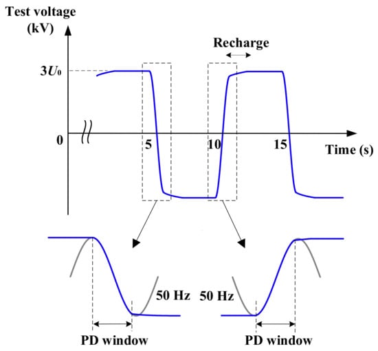 The supply frequency needs to be reduced when the test object is prevailingly capacitive, such as high-voltage power cables, which require high capacitive power at power-frequency AC stress condition. Thus, the developed method for reducing the capacitive charging power is to detect the presence of PD activity with very low frequency (VLF) method, like stressing the test object at 0.1 Hz, or by using damped AC method in the range of 20–1000 Hz [,], which has been increasingly popular for the PD detection of high-voltage power cables []. On the other hand, the supply frequency is enhanced when the test object is prevailingly inductive []. For instance, transformer windings are often tested in the frequency range of 100–400 Hz to avoid core saturation at power frequency during the test [,].
