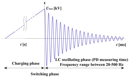 Later, the system referred as Oscillating Waveform Test System (OWTS) was mainly established by E. Gulski, J. J. Smit, et al. at Delft University of Technology (TU delft) [,,]. It has been widely used and most of detection results are obtained based on this system. To generate a DAC voltage waveform, as shown in Figure 5, the cable is charged with a DC steady state electric field over a period of just a few seconds, which has little effect on the property of insulation system. After charging-up stage, the cable is switched in series with an external air-core inductor. Thus, an oscillating voltage wave is used as an excitation voltage for PD detection. The schematic diagram of OWTS measuring circuit for PD detection and location in power cable is shown in Figure 6.