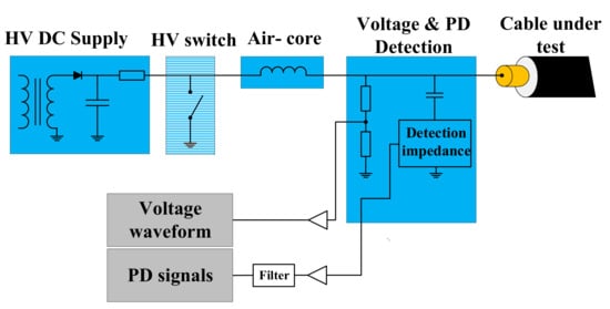 PD measurements on particular power cables with DAC voltage excitation have been performed much at TU delft based on both laboratory and on-site tests [,,,,,,,,,,,]. In general, one or more PD detection units can be connected to at least one of the cable terminations or cable joints. A proper triggering or synchronization between DAC voltage source and PD detection unit is needed, since DAC testing is not continuous but based on voltage excitations as applied to the power cable [].