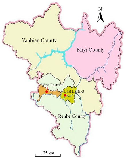 The field study consists of two aspects: the real climatic characteristics of Panzhihua, and the cooling and heating methods and habits of local residents. Four districts and counties of Panzhihua City, namely Bingcaogang (East District), Miyi County, Renhe District, and Yanbian County, were selected to study the climatic characteristics. Locations of the districts and counties are shown in the map of Panzhihua (Figure 2). The hourly outdoor dry bulb temperature, relative humidity, and other parameters during a recent 10-year period (2009–2018) were analyzed. According to the climate zoning method in the Chinese national standard “Code for Thermal Design of Civil Building” [15], the average temperature of the coldest month, the average temperature of the hottest month, the number of heating degree days and the number of cooling degree days were counted as the main indicators of Panzhihua, thereby determining the actual climate zone of Panzhihua and thus the corresponding building energy-saving design schemes.