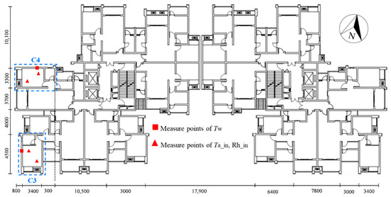 Locations of the tested rooms and measurement points for the wall temperature (Tw), indoor air temperature (Ta_in), and relative humidity (Rh_in). Unit of dimensions in the figure is millimeter (mm).