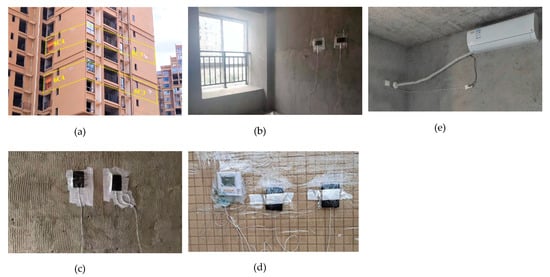 Photos of (a) exterior view of the tested rooms; (b) interior view of the tested rooms; (c) sensors mounted on the inside wall; (d) sensors mounted on the outside wall; (e) split air conditioner.