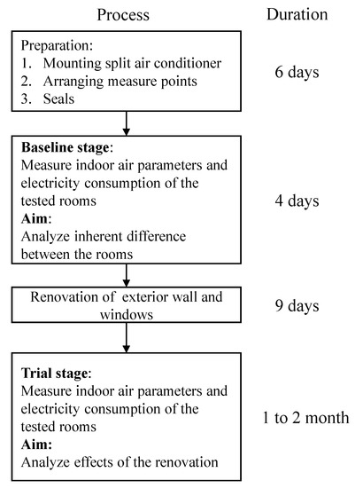 Figure 5 shows the test flow diagram. The test was divided based on the renovation into the “baseline stage” and the “trial stage.” The baseline stage was designed to study the inherent differences between the sixth floor and the eighth floor. Excluding these inherent differences, the differences resulting from the renovation were analyzed during the trial stage.