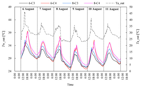 Figure 6 shows the monitoring data of the outer wall surface temperature and outdoor air temperature of the four rooms for six consecutive days after the renovation, and Table 4 details the peaks of the outer wall surface temperature, outdoor air temperature, and appearance of the peak values for six consecutive days of testing. As shown in the figure, the peak outer wall surface temperature of the two rooms numbered C4 is significantly higher than that of the rooms numbered C3, and the average differences of peak Tw_out between the two rooms on the sixth and eighth floors were 3.6 °C and 2.7 °C, respectively. In addition, the time at which the peak values of the wall surface temperature occurred also differed significantly between rooms with different orientations: The peak of C3 usually occurred at approximately 15:00, which was close to the time of peak outdoor air temperature, whereas the peak of C4 usually occurred at between 17:00 and 18:30. This phenomenon indicates that the fluctuation of the outer wall temperature of rooms toward south was dominated by the fluctuation of outdoor air temperature, whereas the rooms toward west were affected more by the western sun exposure. The high intensity solar radiation in the Panzhihua area can make a considerable temperature difference between the peak temperature of the outer wall surface of a western-exposed room and a non-western-exposed room.