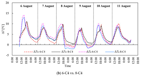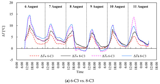 Variation curves of temperature differences between indoors and outdoors (ΔTa) and the outer and inner surfaces of the exterior wall (ΔTw) for (a) 6-C3 and 8-C3 and (b) 6-C4 and 8-C4.