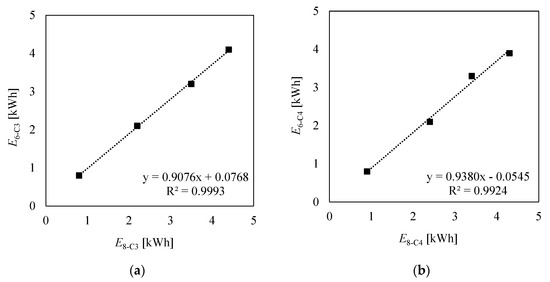 Regressed function between daily electricity consumption of (a) 6-C3 and 8-C3 and (b) 6-C4 and 8-C4 at the baseline stage.