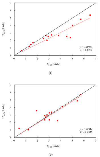 Corrected electricity consumption (*E) versus actual consumption (E) for (a) 6-C3 and (b) 6-C4.