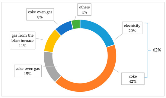 The subject of the research is the resource intensity of the steel industry in Poland, analysed in the area of resource consumption (energy utilities) in steel production processes. Two key resources were analysed: electricity and coking coal (coke), i.e., energy and coke intensity. Energy consumption is the consumption of electricity per 1 tonne of steel produced in electric furnaces (Electric Arc Furnace (EAF) technology/installation) and converters (Basic Oxygen Furnace (BOF) technology/installation). Coke intensity is the unit of coke consumption employing the technology: BF-Basic Furnace. Integrated steel plants are equipped with both BF and BOF installations, hence their joint analysis as a process: BF + BOF (in this process, two energy media are analysed simultaneously, i.e., coke and electricity). In the Polish steel industry, 20% of the total energy resources used in steel production is electricity. Coke in the overall structure of resources used (energy media) accounts for 42%. Figure 1 shows the structure of energy media consumption in the steel industry in Poland. The analysed power resources in total account for 62% of all utilities consumed by steel mills in Poland.