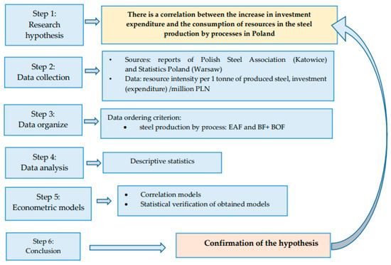 The data used for the research comes from industry and industrial reports of institutions dealing with data collection in Poland: Statistical Office (GUS) and Polish Steel Association (HIPH). The collected data were assessed from the point of view of their usefulness for the purposes of the research topic. The statistical data included in the yearbooks described the entire steel industry. Before conducting our own research, the data on the consumption of energy utilities and completed investments were organised according to the analysed production processes. Carrying out research on the impact of investments on resource consumption by the steel sector in Poland (consumption of utilities: electricity and coke in steel production processes), descriptive statistics and econometric modelling (study of the interdependence of characteristics) were used. Figure 2 shows the phases of the research methodology used in our research.