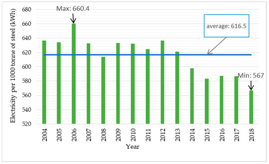 The data show that from 561.4 to 655.9 kWh of electricity is consumed per 1 tonne of steel produced (in total in electric steel mills and integrated steel mills in the analysed period [59]. Figure 3 shows the unit electricity consumption (per 1 tonne of steel) in the years 2004–2018. In the last four years (from 2014 to 2018), the average electricity consumption was 452 kWh per 1 tonne of steel produced. In the entire analysed period, the average electricity consumption was 557 kWh/1 tonne of steel.