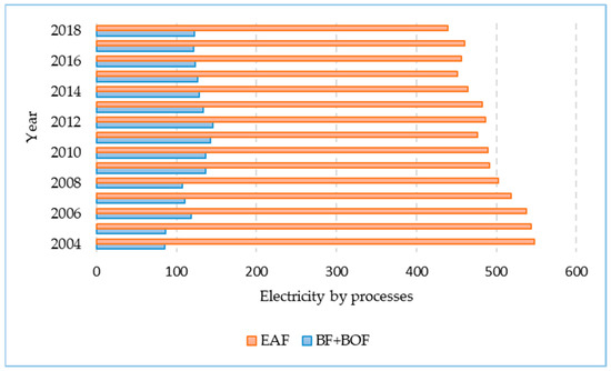 Electricity consumption is higher in the production of steel in the EAF process installation than in the BF + BOF installation (Figure 4). For comparison, in 2004 the electricity consumption of EAF technology was 6.4 times higher than in the BF + BOF technology. In 2018, electricity consumption of EAF technology was 3.6 times higher than in BOF. In 2004–2018, electricity consumption in the steel production process using EAF technology decreased by 19.89%.
