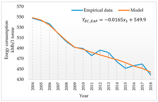 where: YEC_BOF—unit energy consumption in steel mills with the EAF installations in relation to production volume (kWh /1 tonne of crude steel from the EAF process) and x1—realised investments in steel companies with the EAF installations (cumulative investment values since 2004, in PLN million).