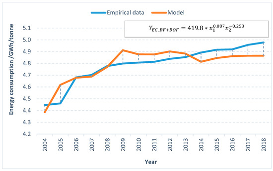 where: YEC_BF + BOF—unit energy consumption in blast furnaces and converter steel mills in relation to production volume (kWh/1 tonne of crude steel), x1—realised investments in steel companies with the BF + BOF installations (cumulative investment values since 2004, in PLN million) and x2—coke consumption in blast furnaces and converter steel works (thousand tons).