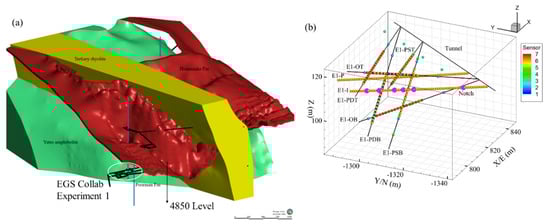 Geological model and layout of holes of EGS Collab Testbed Experiment 1 []. (a) EGS Collab Testbed Experiment 1 is entirely located within Poorman Formation at 4850 ft depth. (b) Six holes (E1-OT/OB, E1-PSB/PST and E1-PDT/PDB) are used as monitoring wells. E1-I and E1-P are injection well and production well, respectively. The six pink spheres along E1-I are notches. The contours represent different types of sensor. For example, Sensor 1 is the 24 hydrophones, Sensor 2 is the 18 accelerometers, Sensor 3 is the 4 geophones, Sensor 4 is the 17 continuous active sources seismic monitoring, Sensor 5 is the 96 thermistors, Sensor 6 is the 123 seismic shot and Sensor 7 is the 96 ERT electrode.