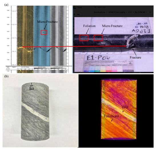 Four rock formations are presented in this region: the Poorman Formation, the Yates amphibolite, the Homestake Formation, and the Tertiary Rhyolite dikes (Figure 1a). EGS Collab Testbed Experiment 1 is entirely located within the Poorman Formation, a metasedimentary rock consisting of sericite-carbonate-quartz phyllite (the dominant rock type), biotite-quartz-carbonate phyllite, and graphitic quartz-sericite phyllite []. Carbonate minerals present consist of calcite, dolomite, and ankerite. The rock shows intense multiscale folding with foliations at different scales; it contains carbonate, quartz veins/boudinage, pyrrhotite, and minor pyrite. Other mineral phases (in addition to those listed above) include graphite and chlorite. The Poorman Schists contains different type of discontinuities such as open and sealed natural fractures, foliations planes, and different mineralization bands distributed at different scales. The mechanical deformation, failure behavior, and transport properties of subsurface rock mass are highly influenced by these natural discontinuities and fabric features. The detailed geologic descriptions of those formations can be found elsewhere [].